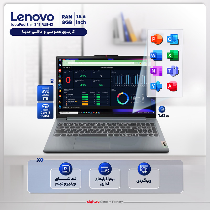 متاسفانه این کالا در حال حاضر موجود نیست. میتوانید از طریق لیست بالای صفحه، از محصولات مشابه این کالا دیدن نمایید.لپتاپ لنوو مدل IdeaPad Slim 3 15IRU8 با وزن 1.62 کیلوگرم به خوبی میتواند نظر دوستداران لپتاپهای سبک را جلب کند. این لپتاپ در بخش مشخصات سختافزاری به پردازنده Core i3-1305U اینتل مجهز شده که یک پردازنده 5 هستهای متشکل از ( 1 هسته Performance و 4 هسته Efficient) با 6 رشته موازی است که نهایت فرکانس کاری 4.5 گیگاهرتز و 10 مگابایت حافظهنهان یا کش آن را همراهی میکند. نبود تراشهگرافیکی مجزا تکلیف خریداران را با این لپتاپ روشن میکند. تراشهگرفیکی یکپارچه UHD اینتل گزینه خوبی برای کارهای عمومی و روزمره است و نباید از آن انتظار پردازشهای سنگین گرافیکی را داشت. مقدار هشت گیگابایت رم LPDDR5 با سرعت 4800 مگاهرتز و البته یک ترابایت حافظهداخلی از نوع SSD NVMe با رابط PCIe 4.0 روی این مدل نصب شده است. در بخش نمایشگر با پنل 15.6 اینچ TN روبرو هستیم که روکشمات و نهایت روشنایی 250 نیت، عملکرد قابلقبولی را ارائه میکند. لنوو در بخش صدای خروجی کمکاری نکرده به طوری که دو اسپیکر استریو با توان 1.5 وات، صدای دالبی را به گوش میرساند. تاچپد بزرگ با پشتیانی از چندلمس همزمان و البته کلیدهای مخفی یا Mylar surface، وسعت مناسبی از عملکرد را در اختیار کاربر قرار میدهد. پورتهای ورودیوخروجی کامل و باتری 47 واتساعت از دیگر مشخصات لپتاپ لنوو مدل IdeaPad Slim 3 15IRU8 است. لازم به ذکر است این لپتاپ توسط شرکت واردکننده کاستوم شده و برخی از مشخصات آن ارتقا یافته است.