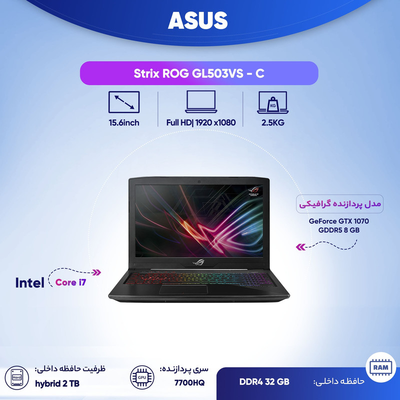 متاسفانه این کالا در حال حاضر موجود نیست. میتوانید از طریق لیست بالای صفحه، از محصولات مشابه این کالا دیدن نمایید.شرکت «ایسوس» در حال گسترش محصولات حرفهای سری STRIX خود است و این سری را با مشخصات انحصاریاش در تمامی محصولات خود، از مادربرد و کارت گرافیک گرفته تا لپتاپ، بست داده است. یکی از لپتاپهای مخصوص بازی همین سری هم ROG GL503VS نام دارد. این محصول بهگونهای طراحی و ساخته شده است که کالایی جذاب و قدرتمند بوده و در عین حال نسبت به رقبای همرده قیمت کمتری داشته باشد. بدنهی این لپتاپ از ترکیب آلومینیوم و پلاستیک ساخته شده است تا وزن آن کمی نسبت به بدنههای تمامآلومینیومی سبکتر شود. قاب پشت صفحهنمایش یا همان لایهی رویی لپتاپ از جنس آلومینیوم برسخوردهی مشکی است که همچنان مانند محصولات قبلی سری G ایسوس، اثرانگشت زیادی به خود جذب میکند و باقی بخشها هم (حتی لایهی داخلی فضای اطراف کیبورد) کاملا از پلاستیک ساخته شدهاند. صفحهنمایش 15.6اینچی این محصول پنل IPS با وضوح بالای Full HD و روکش مات دارد که یک گزینهی عالی برای فیلمدیدن و بازیکردن محسوب میشود. از دیگر امکانات این مدل میتوان به کیبورد جزیرهای با نور پسزمینه، تاچپد یکتکهی باکیفیت، پورتهای متعدد و حرفهای و لوازم جانبی کامل اشاره کرد. در بستهبندی این مدل، یک ماوس و یک هدست مخصوص بازی ایسوس به همراه یک کولهپشتی ایسوس قرار گرفته است. این لپتاپ، مخصوص اجرای بازیهای سنگین روز طراحی و ساخته شده است؛ پس باید سختافزار قوی داشته باشد. پردازندهی مرکزی Core i7 7700HQ اینتل، پردازندهی گرافیکی GeForce GTX1070 انویدیا با 8 گیگابایت حافظهی اختصاصی GDDR5، رم 32گیگابایتی از نوع DDR4 و حافظهی داخلی هیبریدی متشکل از دو ترابایت HDD و 256 گیگابایت SSD، ازجمله مشخصات فنی این لپتاپ بسیار قدرتمند هستند. درمجموع میتوان ROG GL503VS را یکی از خوشقیمتترین لپتاپهای قدرتمند مخصوص بازی دانست.