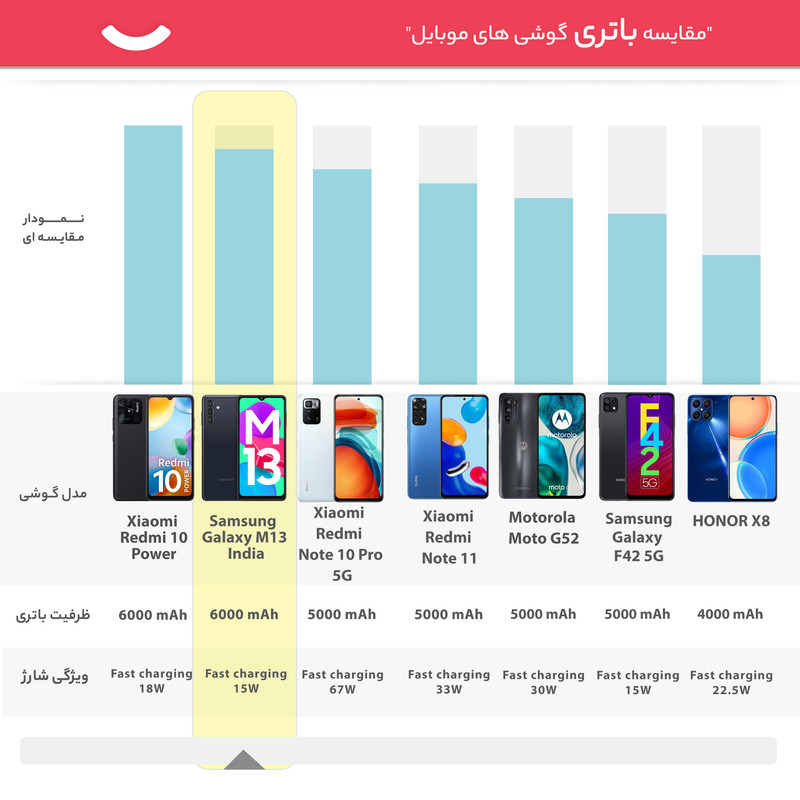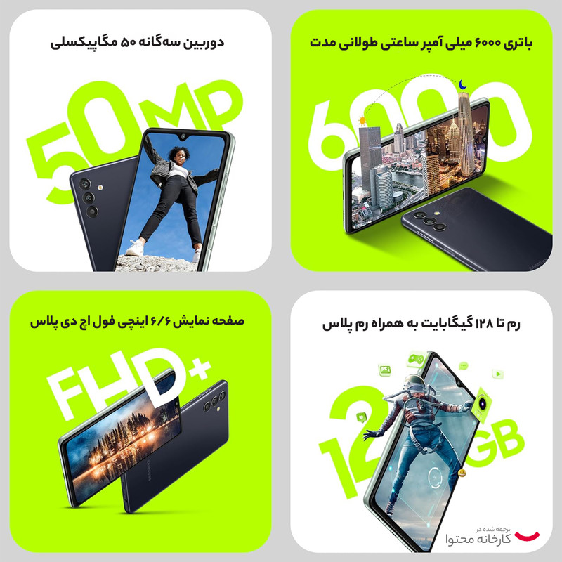 برای خرید گوشیهای میانرده بدون شک گوشیهای سامسونگ با تنوع بالایی که دارند میتواند گزینههای بسیار خوبی برای شما باشد. سامسونگ Galaxy M13 پک هند هم یکی از این گوشیهای هوشمند است که در کنار قیمت مقرون بهصرفه، از مشخصات فنی مناسب و قابل قبولی بهره برده است. لازم به ذکر است که در برخی از مشخصات در نظر گرفته شده، این گوشی به نسبت پک جهانی تفاوتهایی دارد. در نمای روبهرویی این گوشی به صفحهنمایش با ابعاد 6.6 اینچ و رزولوشن 1080×2408 پیکسل از نوع PLS مجهز شده که توانایی نمایش 400 پیکسل در هر اینچ را دارد. دوربین اصلی قدرتمند 50 مگاپیکسل که در نور روز و نور شب عملکرد خوبی دارد در کنار سنسور 5 مگاپیکسل فوق عریضی که امکان ثبت تصاویر با زاویه دید گسترده را برای شما فراهم کرده و یک سنسور 2 مگاپیکسل ماکرو که تاثیر بالایی در ثبت تصاویر پرتره توسط سنسور دوربین اصلی دارد، سنسورهای دوربین سهگانه این گوشی هوشمند میانرده را تشکیل میدهند. بریدگی قطرهای شکل ناچ در قسمت بالایی و مرکزی صفحهنمایش، سنسور دوربین سلفی با رزولوشن 8 مگاپیکسل را در خود جای داده است. بهره بردن از پردازنده اگزینوس 850 هم سبب شده تا سامسونگ Galaxy M13 توانایی ارائه عملکرد قابل قبولی در اجرای بازیهای محبوب و نرمافزارهای کاربردی داشته باشد. باتری قدرتمند با میزان ظرفیت 6000 میلیآمپرساعت هم اتفاق بسیار خوبی برای این گوشی بوده که توانایی ارائه طول عمر مفید (زمان آماده بهکار) دو روز و حتی بیشتر را در مصرف عادی دارد. در مجموع باید بگوییم که اگر به دنبال خرید گوشی هوشمندی هستید که از قیمت مقرون بهصرفه بهره برده باشد و از طرفی در بخش دوربین اصلی، باتری و پردازنده عملکرد قابل قبولی داشته باشد، Galaxy M13 میتواند یکی از گزینههای خوب شما باشد. گوشیهای اکتیو هم به این شکل هستند که به دلیل محدودیتهای برخی از محصولات برای کشور ایران، در کشورهای همسایه بهصورت رسمی با یک بار قرار گرفتن سیمکارت، اکتیو شده تا امکان استفاده در کشور وجود داشته باشد و پلمپ میشوند و باید بدانید که این پروسه هیچ مشکلی در راستای گارانتی کالا بههمراه ندارد.