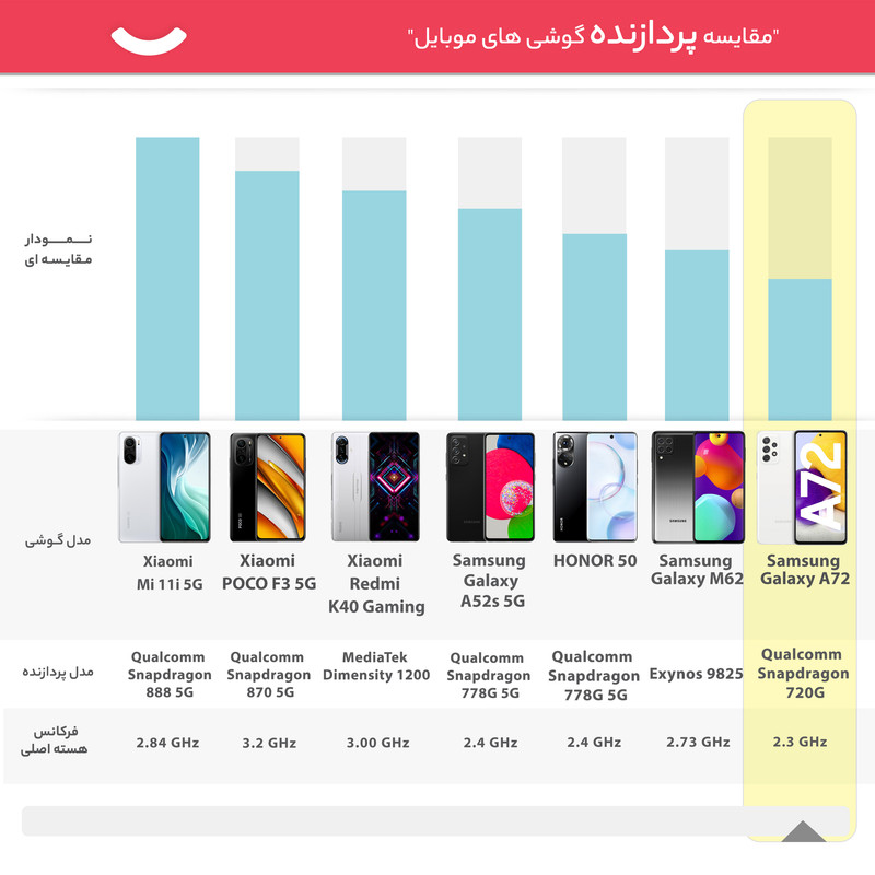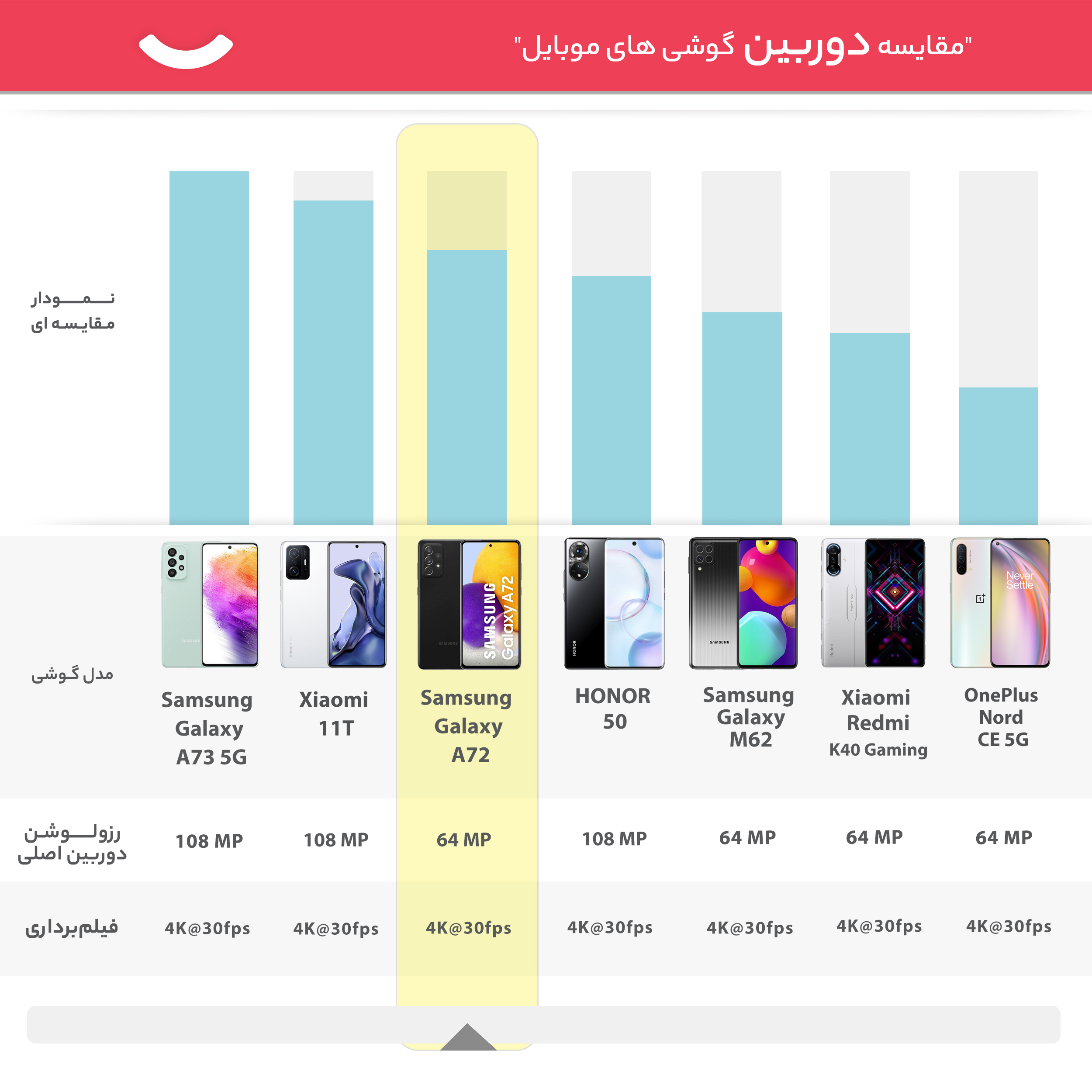 این نسخه از گوشی موبایل Galaxy A72 با رم 8 گیگابایتی و حافظه داخلی 128 گیگابایت به عنوان یکی از جدیدترین میانردههای سامسونگ روانه بازار شده است. این محصول دارای صفحهنمایش سوپر امولد است و ظاهر زیبایی دارد. سامسونگ تلاش کرده است حاشیه را در این تولید جدید خود تا حد امکان کم کند. این گوشی قاب پشتی از جنس پلاستیک دارد و قاب جلویی آن را شیشه پوشانده که البته جلوهی زیبایی به گوشی داده است. این محصول سامسونگ با نسخه 11 از سیستمعامل اندروید روانه بازار شده است تا از هر نظر گوشی مدرن بهحساب بیاید. صفحهنمایش استفادهشده در این گوشی 6.7 اینچ با رزولوشن FullHD+ است که با استفاده از فناوری Super AMOLED و پنل OLED تصاویر شفاف و بینظیری را به نمایش میگذارد. این صفحهنمایش در هر اینچ 394 پیکسل را نشان میدهد که این یعنی جزئیات و وضوح تصویر عالی است. همچنین روکش این نمایشگر لایهی محافظ Corning Gorilla Glass است که از خطوخش و ضربه جلوگیری میکند. تراشهی این محصول، Snapdragon 720G از تراشههای 8 نانومتری شرکت کوالکام است که به همراه 8 گیگابایت رم عرضه میشود. تراشهی گرافیکی Adreno 618 هم برای پخش ویدئو و بازی مناسب است. این نسخه از گوشی با حافظه 128 گیگابایتی عرضه شده است. دوربین اصلی A72 سنسور 64 مگاپیکسلی دارد و از نوع عریض (Wide) است. یک سنسور 12مگاپیکسلی و دو سنسور 5 و 8 مگاپیکسلی دیگر هم در کنار این دوربین اصلی مجموعه دوربینهای قاب پشتی A72 را تشکیل دادهاند. دوربین سلفی 32 مگاپیکسلی هم در قاب جلویی این گوشی به کار گرفته شده است. باتری 5000 میلیآمپرساعتی، پشتیبانی از فناوری شارژ سریع 25 واتی، درگاه USB Type-C و حسگر اثرانگشت در زیر قاب اصلی هم از دیگر ویژگیهای این تازهوارد است. سامسونگ در ساخت این گوشی از جدیدترین فناوریهای ساخت گوشی استفاده کرده است تا میانردهای با قابلیتهای نزدیک به یک پرچمدار خوشساخت را روانه بازار کند.